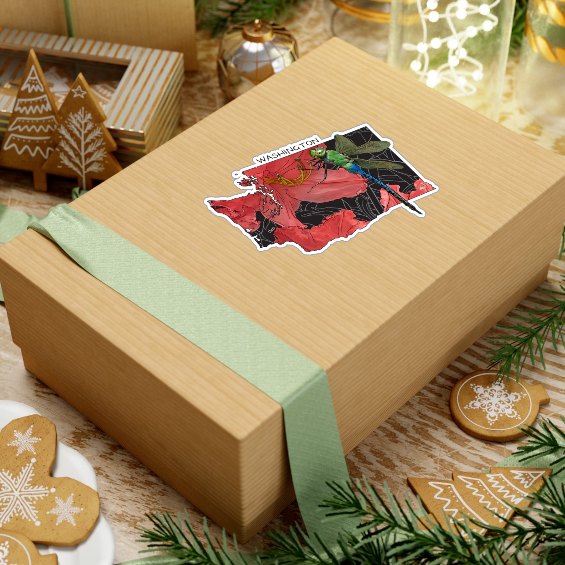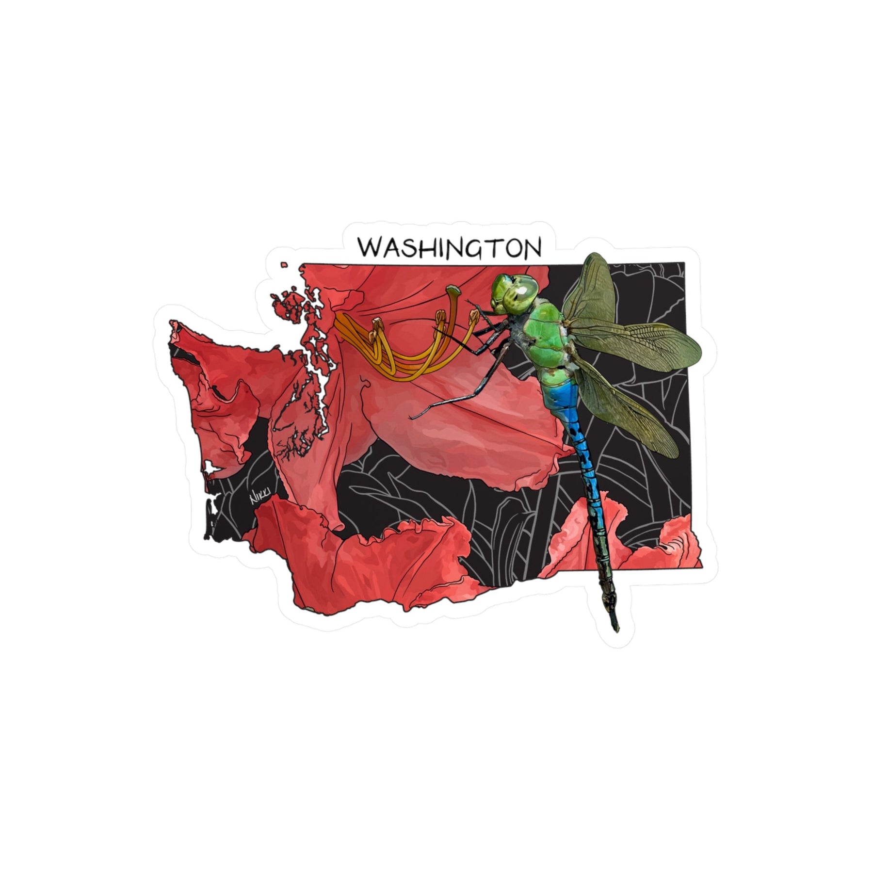 Sticker of a dragonfly on a stylized map of Washington with red and black design elements.